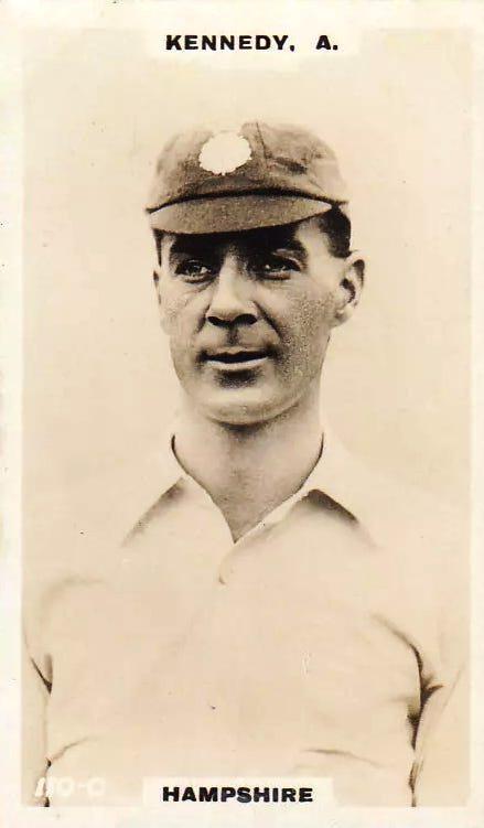 Essex continued their innings cautiously, but when Johnny Douglas was well caught at short leg Essex were in trouble at 83 for five. Whiz Morris turned the situation round in an hour, hitting out powerfully to score 40 out of 71 before Alec Kennedy came back for another spell and bowled him out. Kennedy continued to work his way through the later batsmen, while Jack O’Connor played his steady game. As he began to run out of partners, however, he tried to become more aggressive and was finally out for 73, scored in just over 3¼ hours. Some useful runs from Joe Hipkin saw the last wicket take the score past 200.