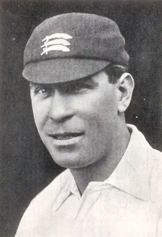After much weekend rain, play finally began at 3.15 today. Surrey’s stand-in opening batsmen, Donald Knight and Alfred Jeacocke, were out for 40 on the board, but the real entertainment came from Alan Peach, promotion to No 3. He hit out brilliantly for 64 in just over half an hour at the wicket before being superbly caught by Reggie Ingle at long-on off Jack White, whose steady and accurate bowling always kept the pressure on the batsmen. Errol Holmes, an amateur debutant, was dismissed without scoring; Percy Fender hit two sixes as he tried to knock White off his length, but the bowler got him for 18 to make the score 150 for six. But Douglas Jardine played a calm, steady innings with help from Herbert Baldwin in a partnership worth 76 runs. Jardine was still there at the close while White had taken six of the eight wickets to fall. Much of the Somerset fielding was brilliant.