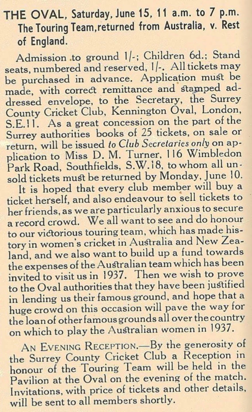 What follows is the latest installment in our series on the inaugural women’s Ashes tour of 1934/35. The previous installment is here.