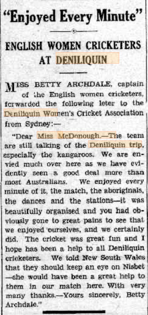Betty Archdale sent a letter of appreciation to the Deniliquin Association: