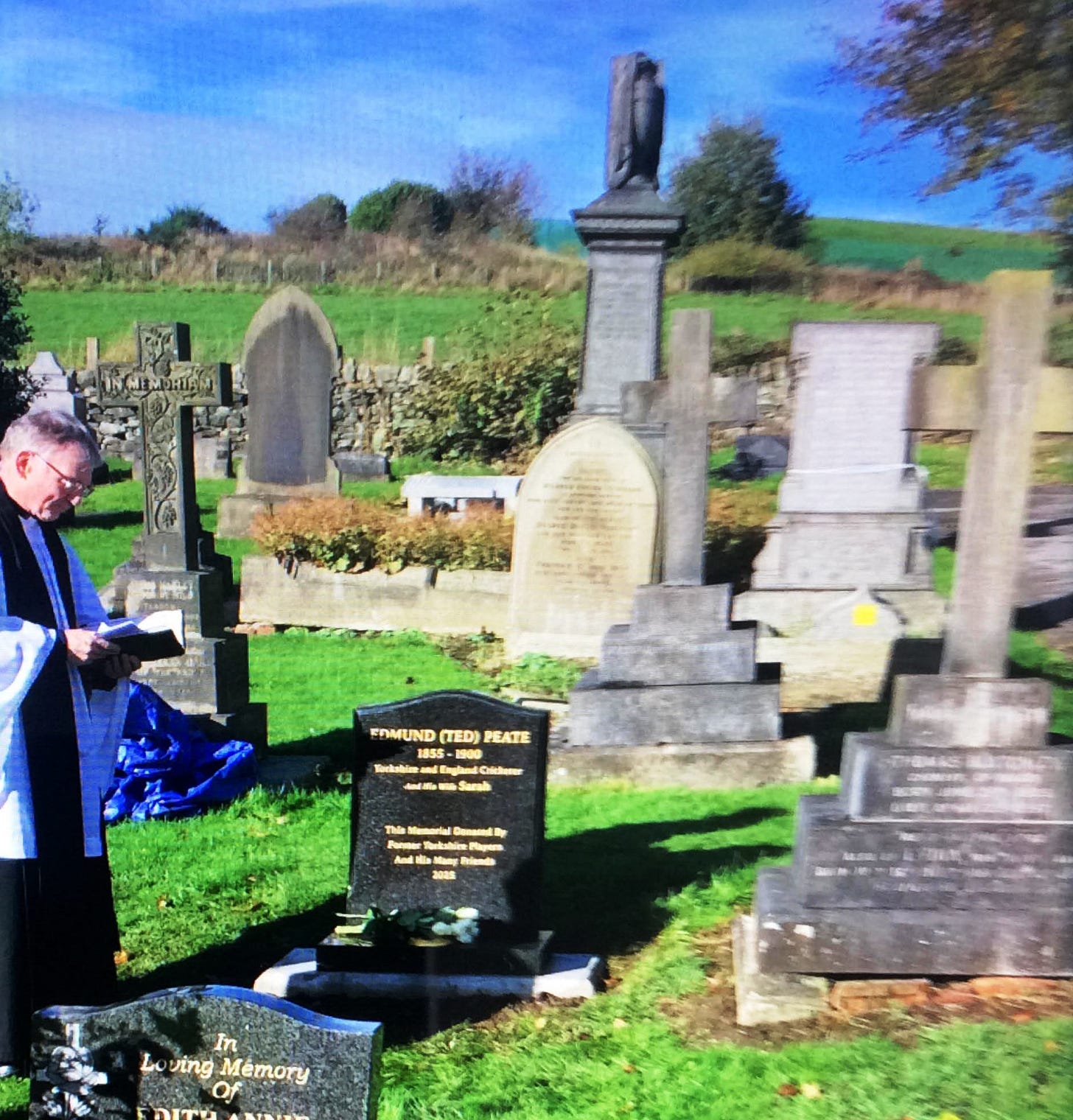 And today, at last, the deed was done. Under skies much brighter than those under which he was consigned to his place of rest, the Yorkshire Old Players Association gathered to honour him. Geoff Cope and Kevin Sharp stood as emissaries, and were joined by Peate’s descendants and admirers. A service was held, simple and beautiful, beside the new headstone that bears his name: